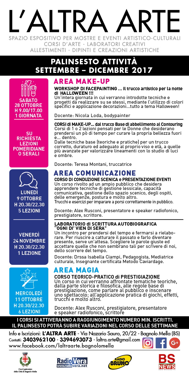 > PER I NON TESSERATI: TESSERAMENTO 2017 € 10. Verrà consegnato un buono sconto del 10% spendibile presso L'ALTRA ARTE entro il 31/12/2017.
