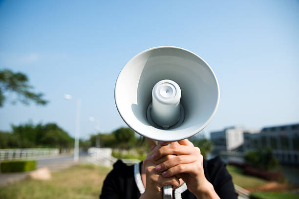 Businesswoman shouting through the megaphone in the open air.